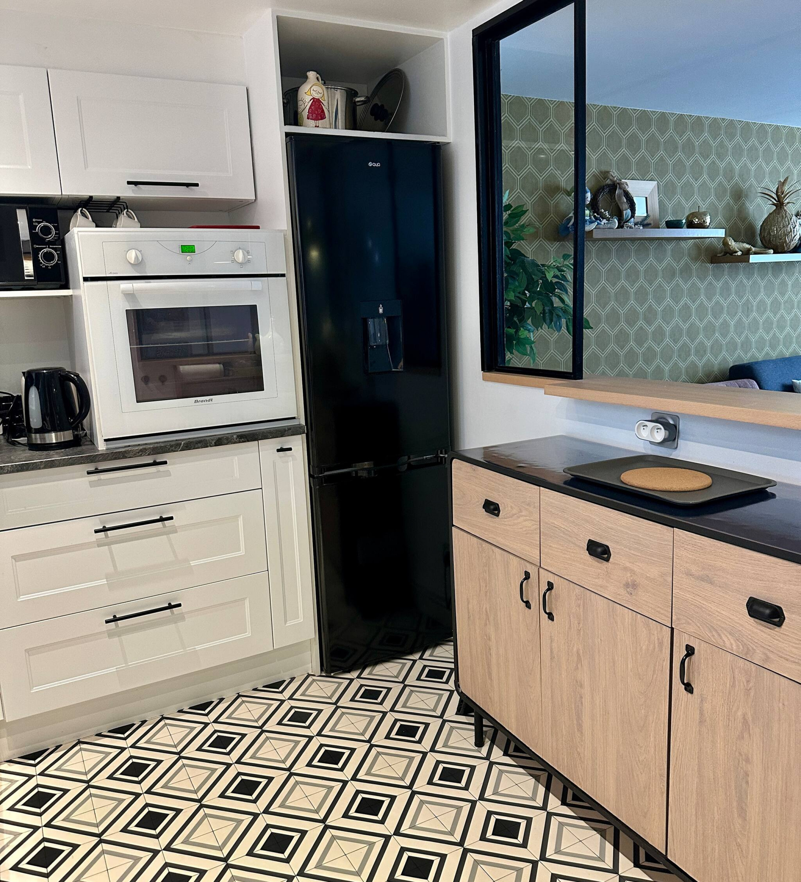 The flat has a fully equipped kitchen, a tastefully redecorated living room, a bathroom with a washing machine, and a separate toilet.