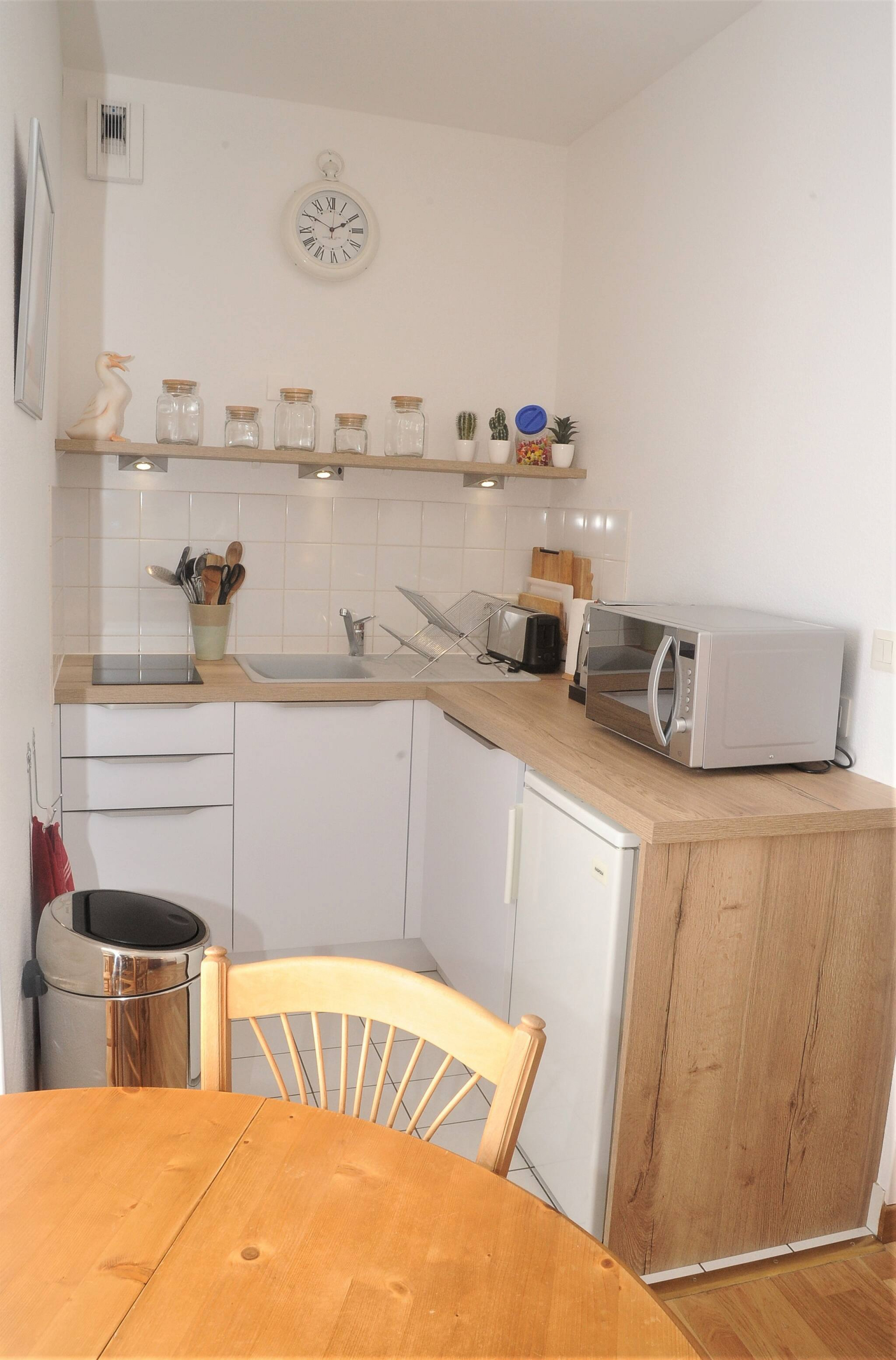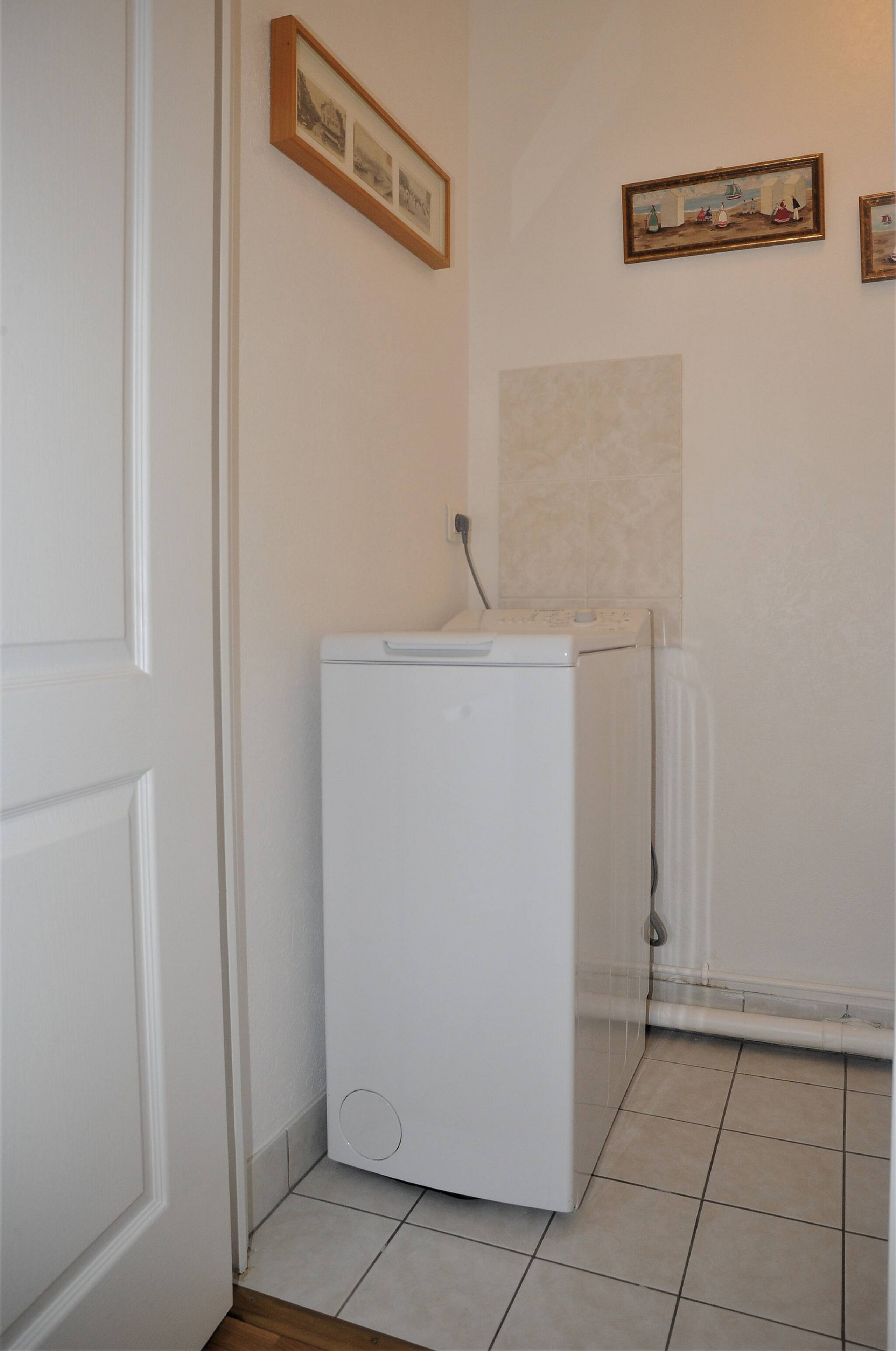 The bedroom has large storage spaces and is very bright. The bathroom is separate and equipped with a washing machine. The toilet is separate. The spacious and bright living area has a sofa bed and a fully equipped kitchen area.