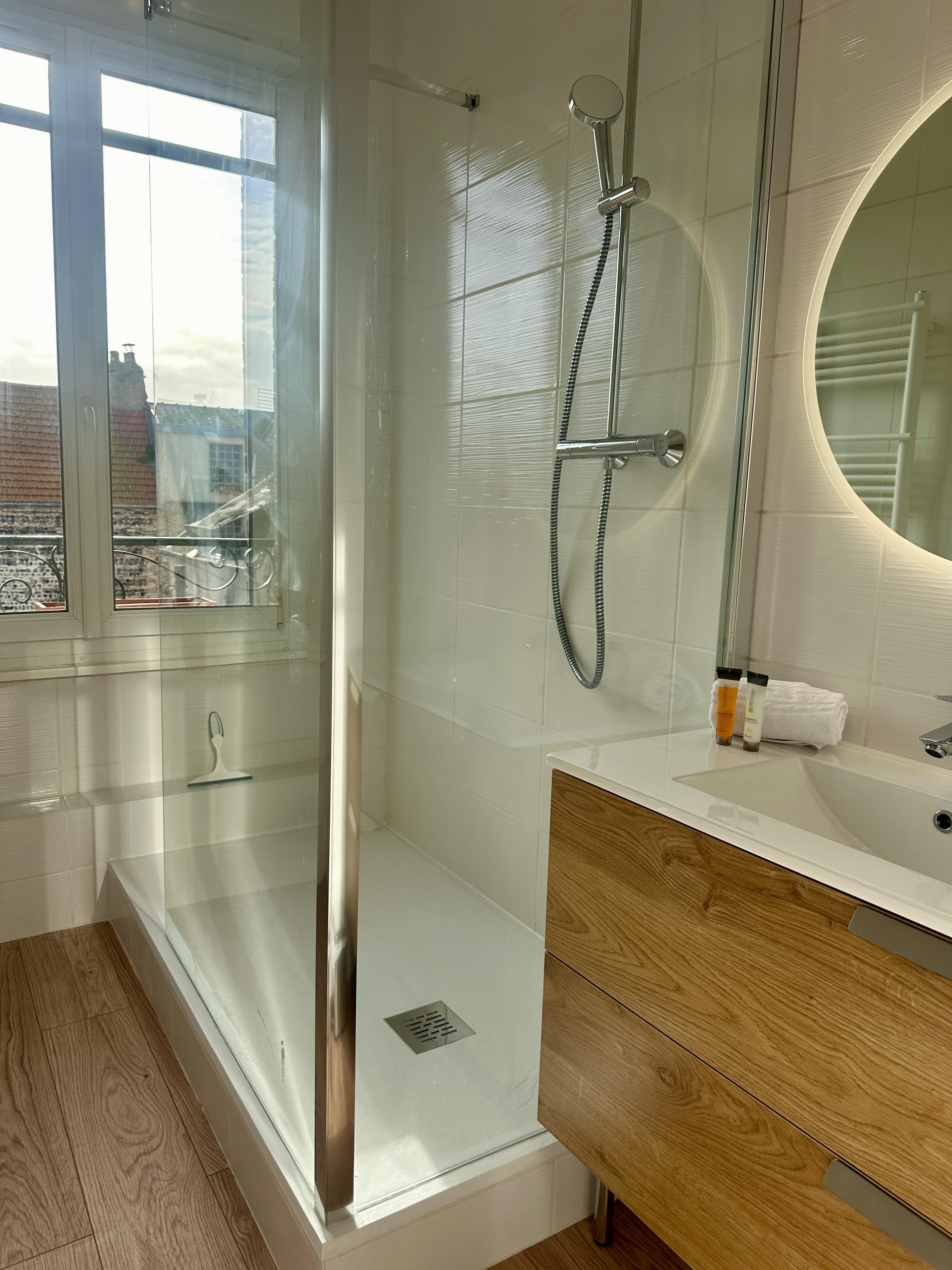 A fully equipped kitchen will make you want to cook! The bathroom features a walk-in shower and a large window overlooking the city rooftops.