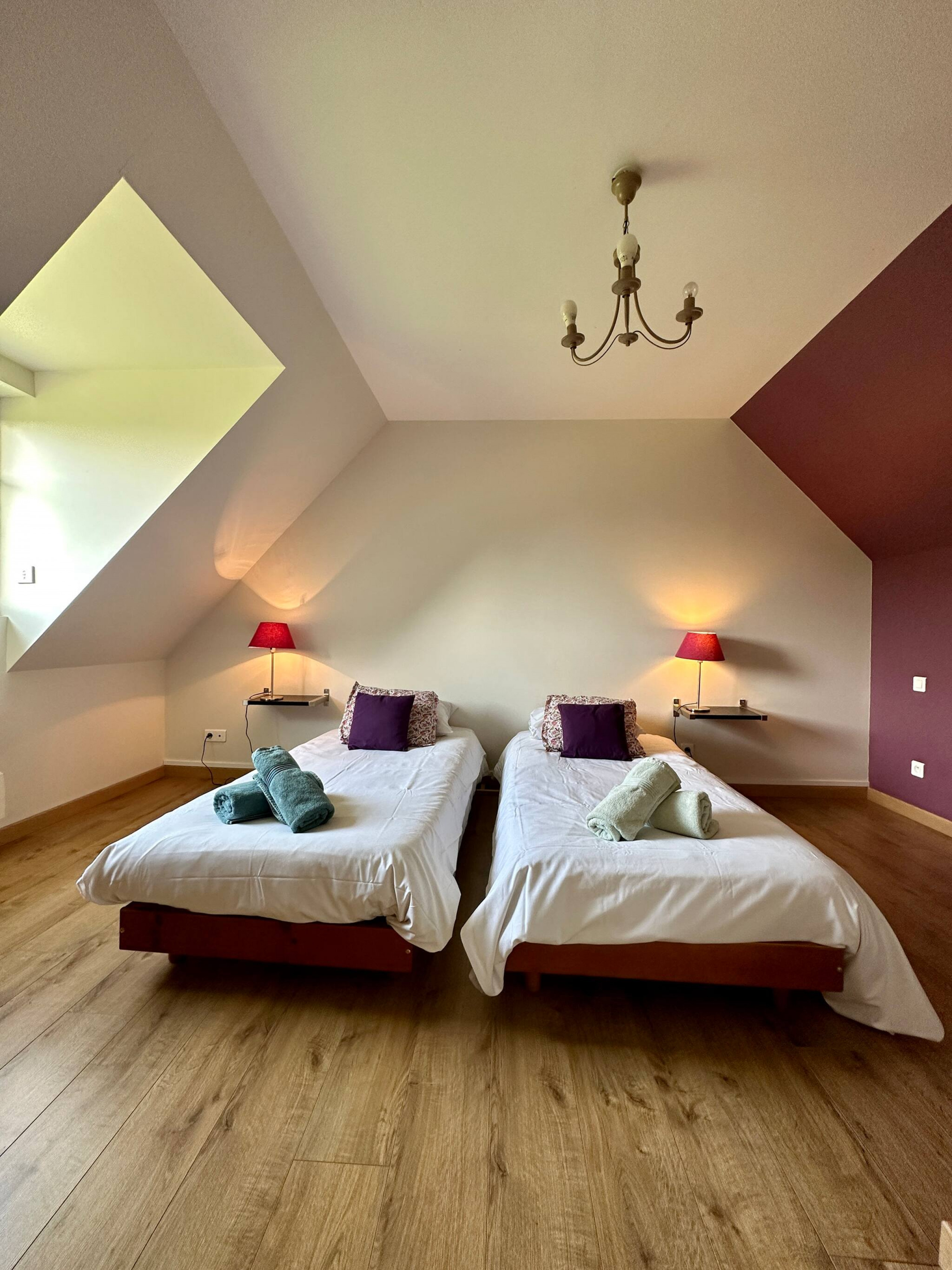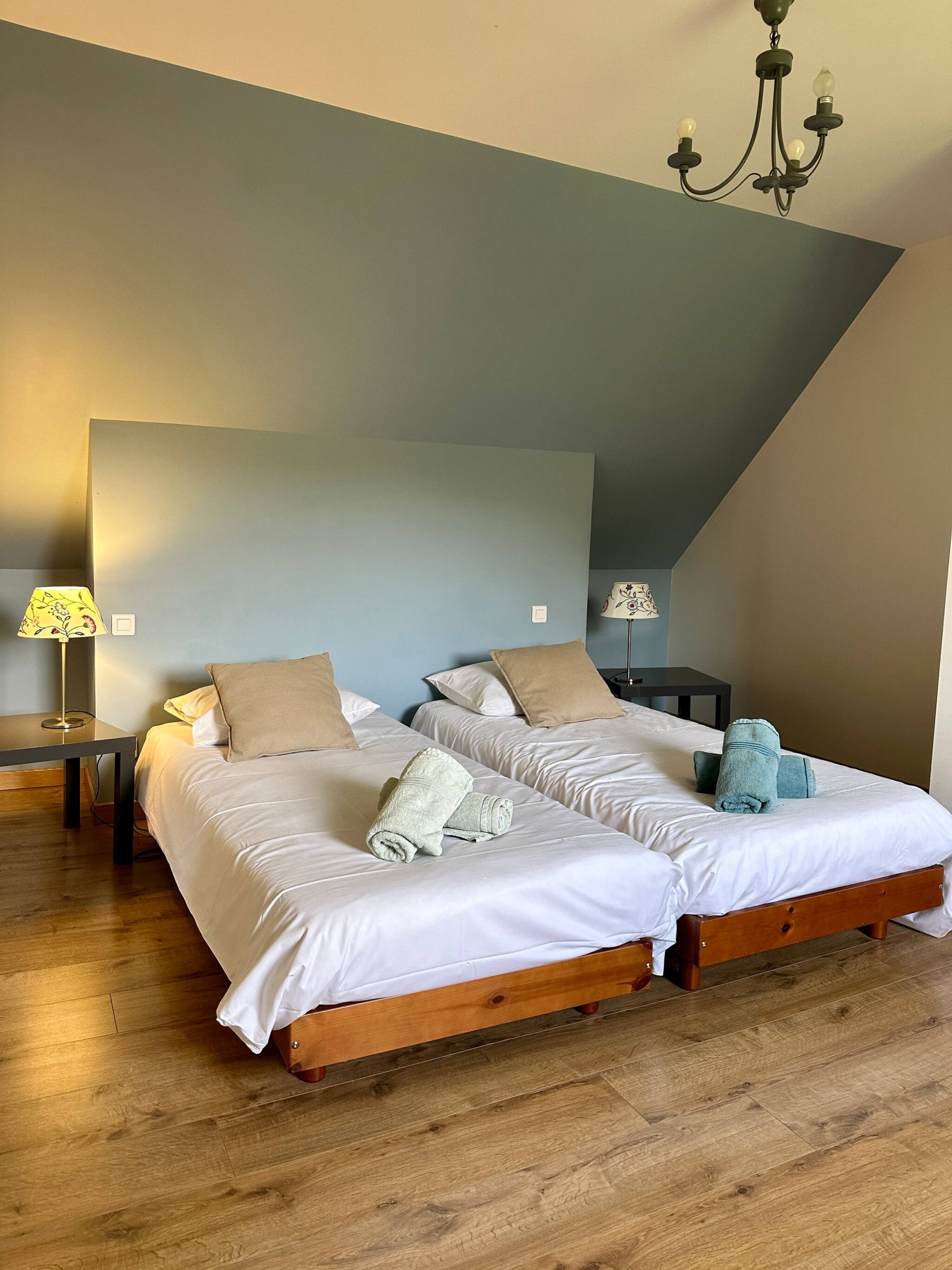 Upstairs: 2 bedrooms with 2 single beds (90x190) with chest of drawers, 1 bathroom with toilet.