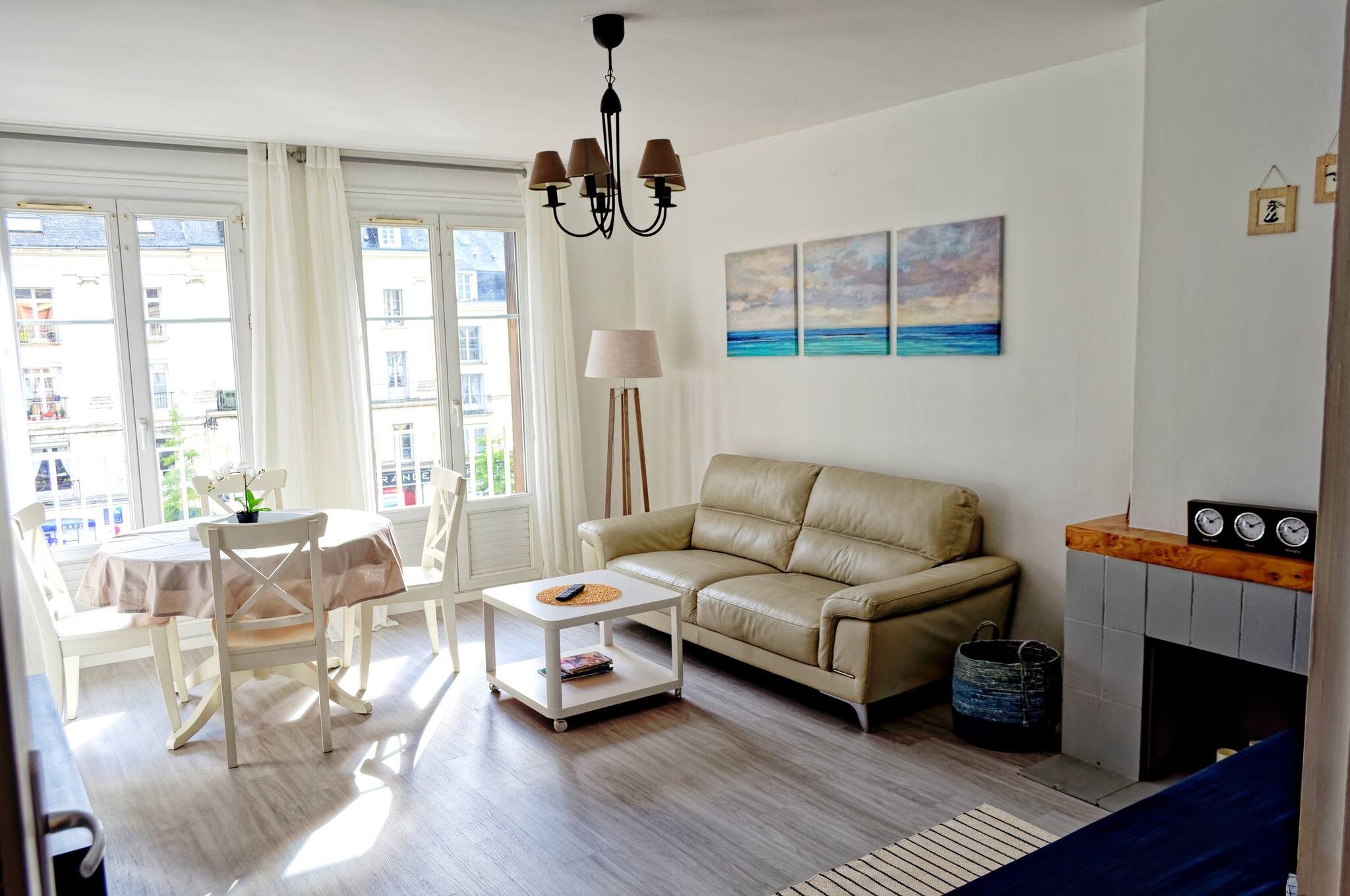 The Les Cerfs Volants apartment is rated *** and is located on the third floor without a lift. It is very bright and offers an unobstructed view of Saint Jacques Church and the market square on Saturday mornings.