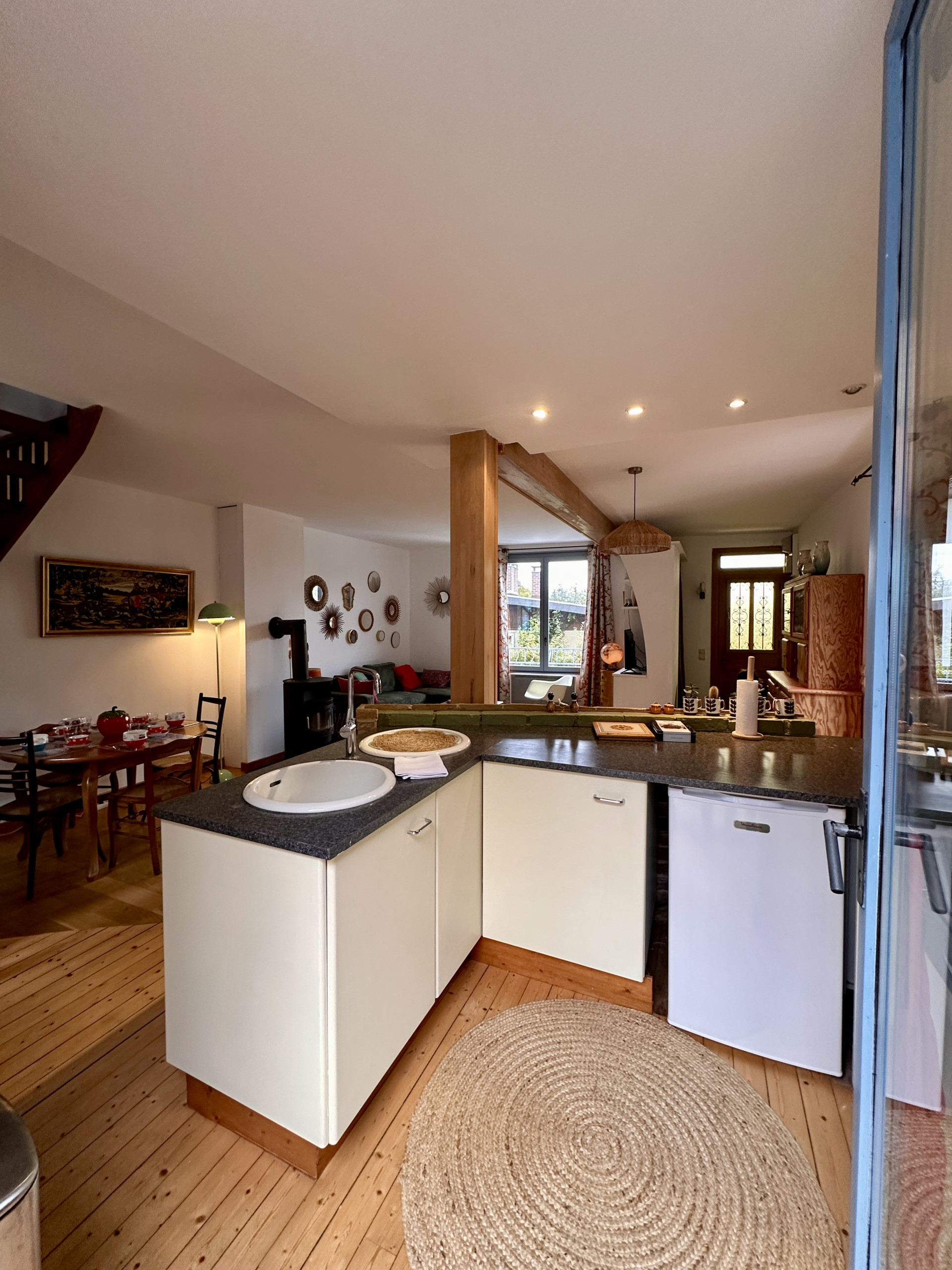Le rez-de-chaussée comprend une cuisine entièrement équipée donnant sur le salon et des toilettes.