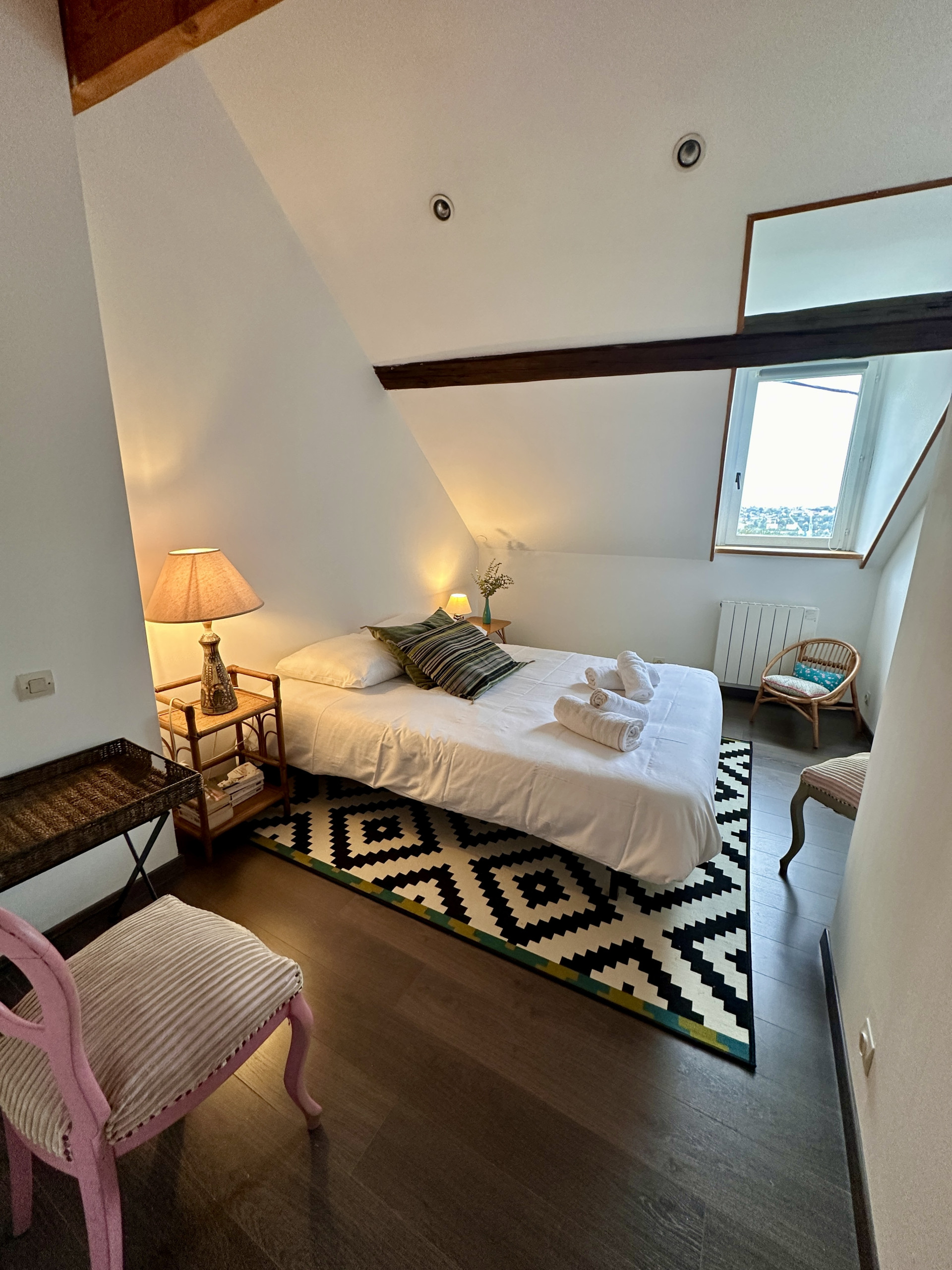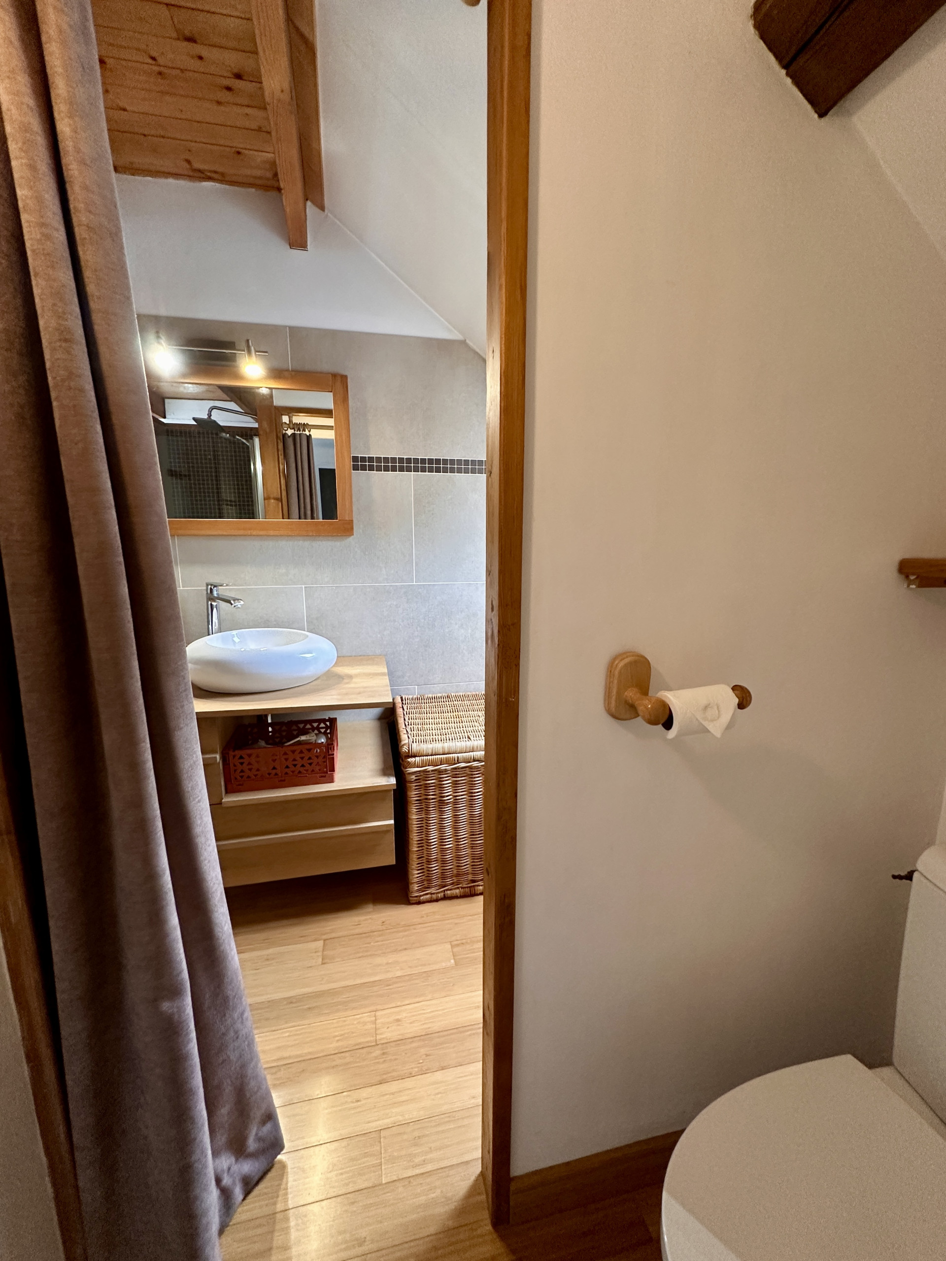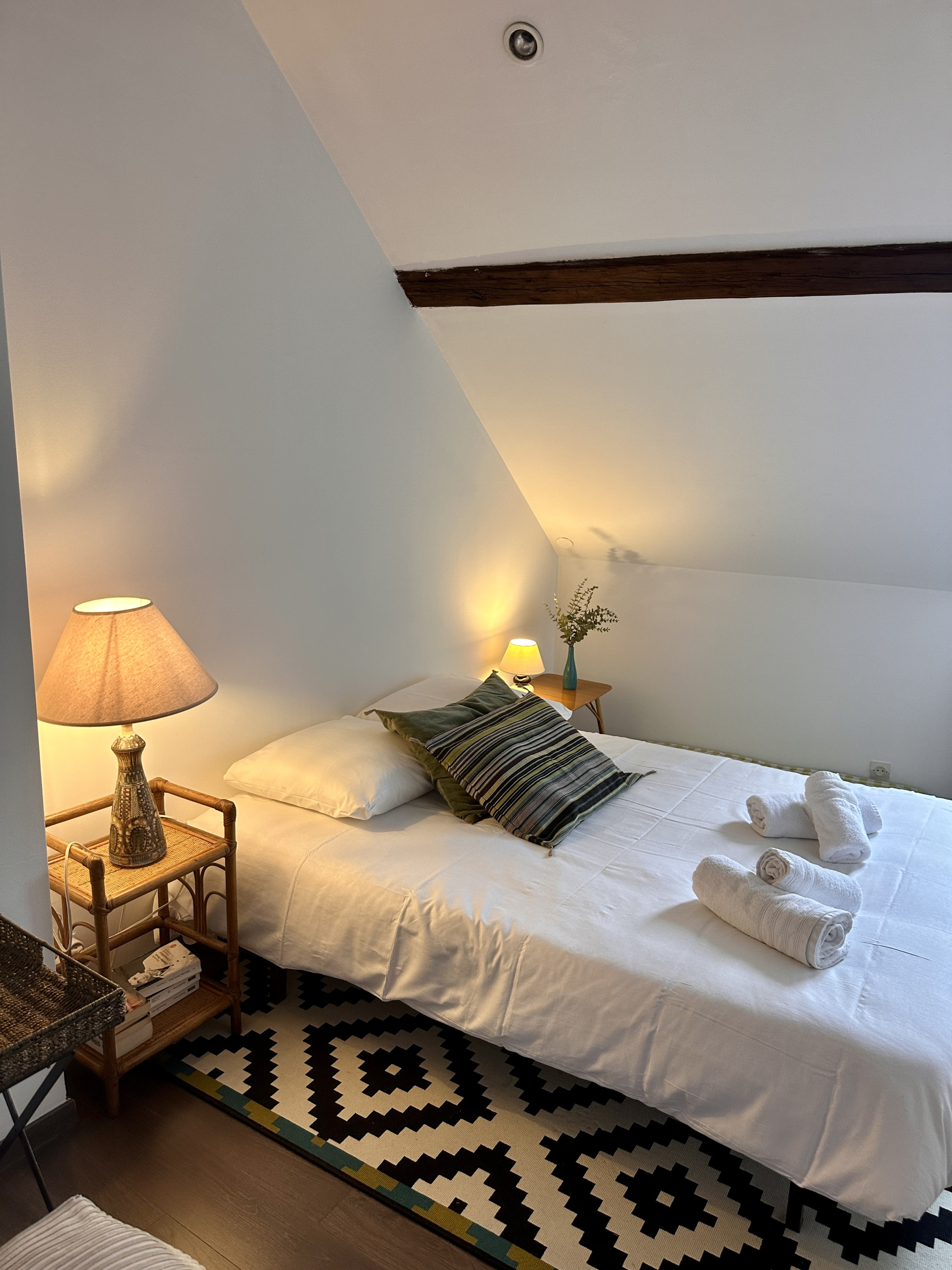 Premier étage : 1 chambre avec un lit double de 160 x 200 cm, une salle de bain et des toilettes.
