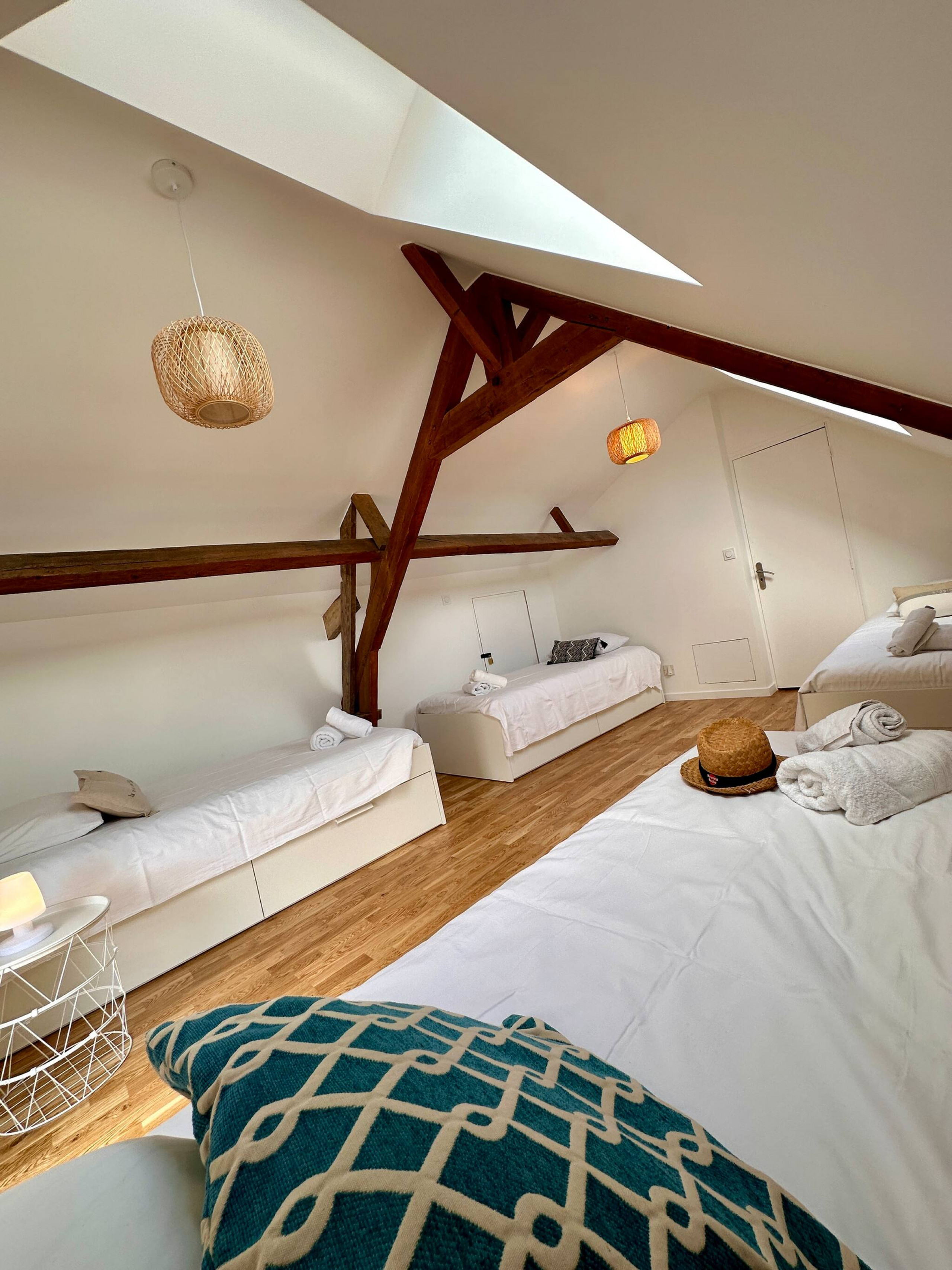 Deuxième étage : deux chambres mansardées avec trois lits simples.