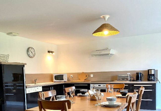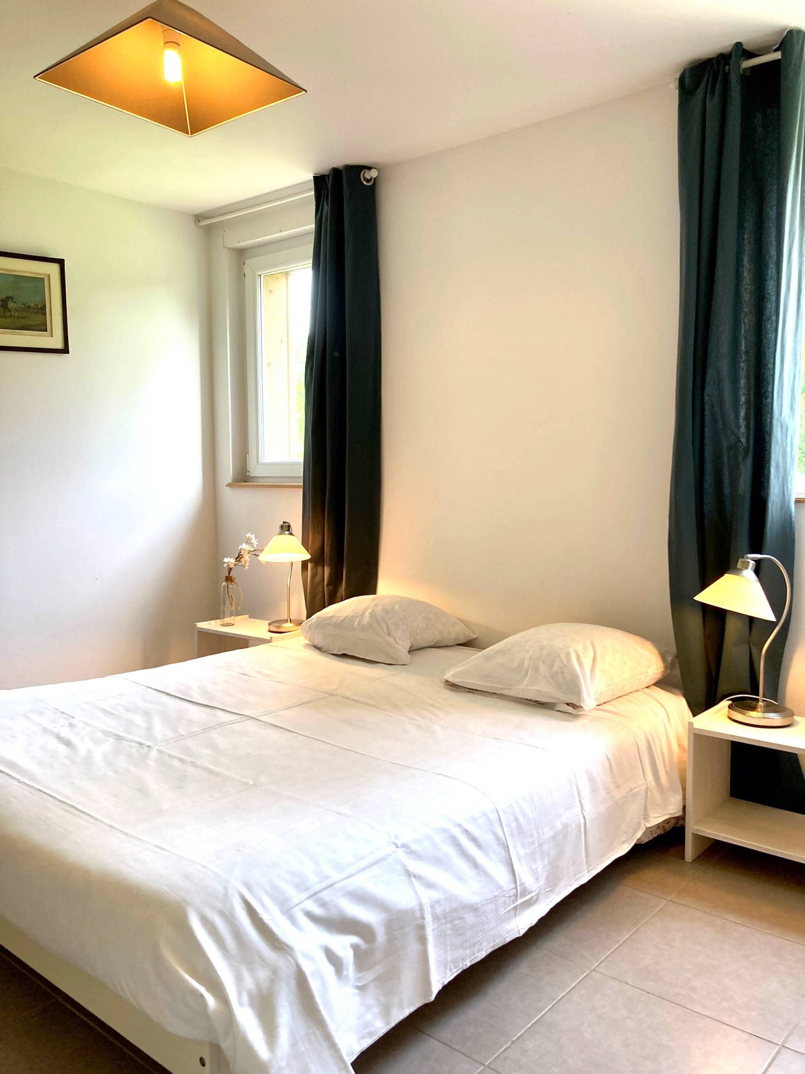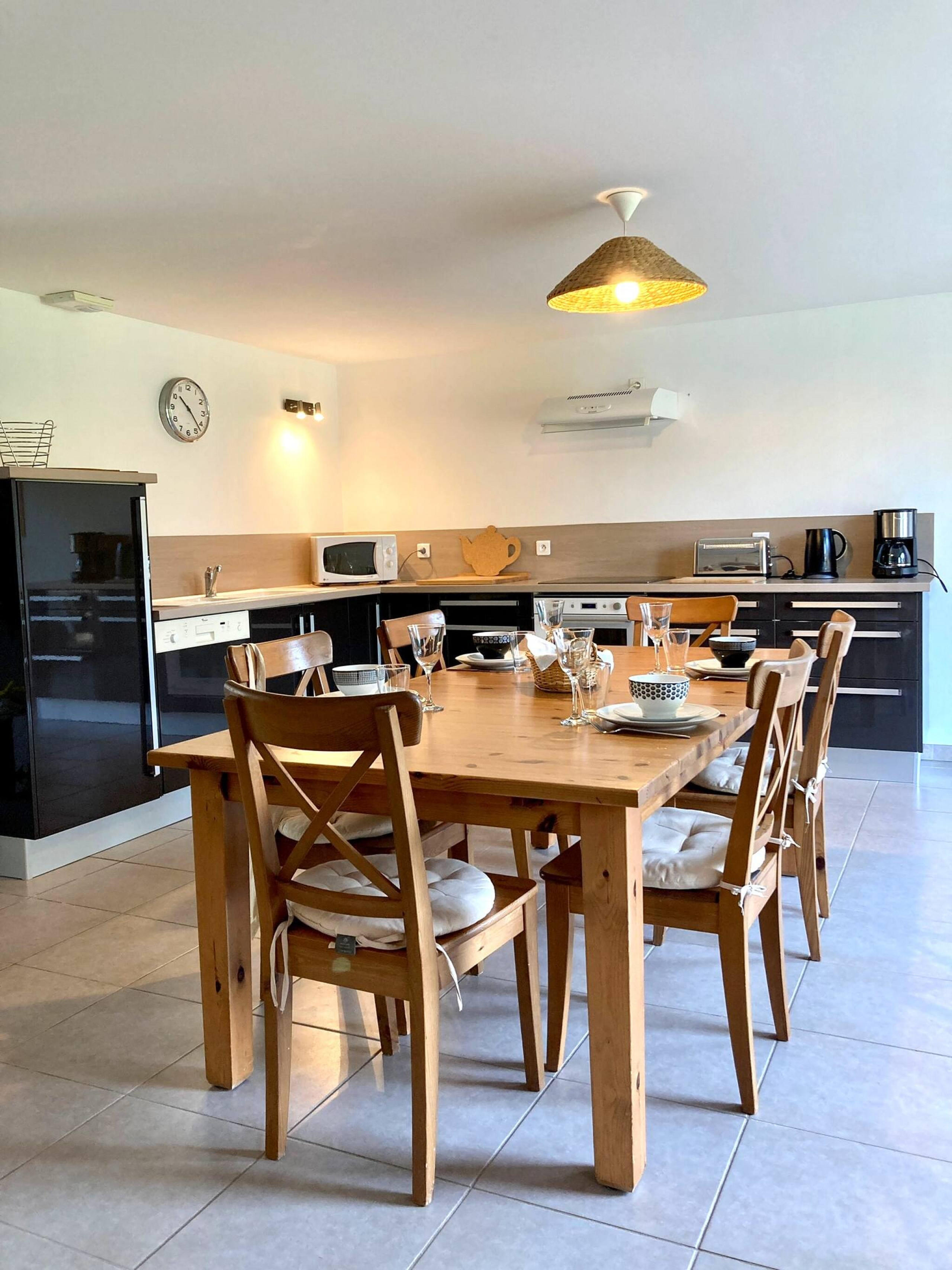 Une grande cuisine aménagée et équipée, un grand hall, un salon avec deux canapés, une chambre principale (lit de 160x200), une salle de douche et des toilettes séparés.