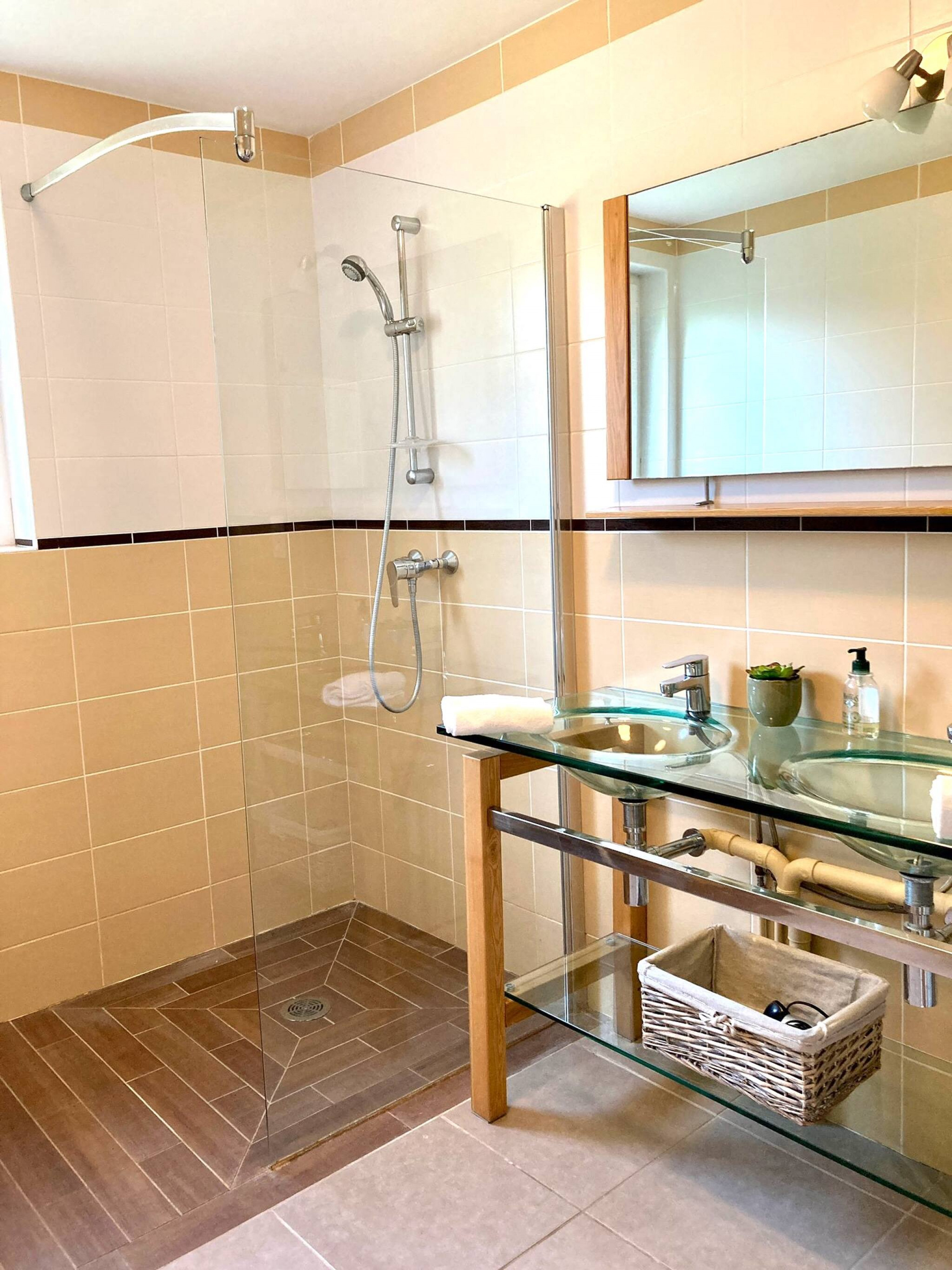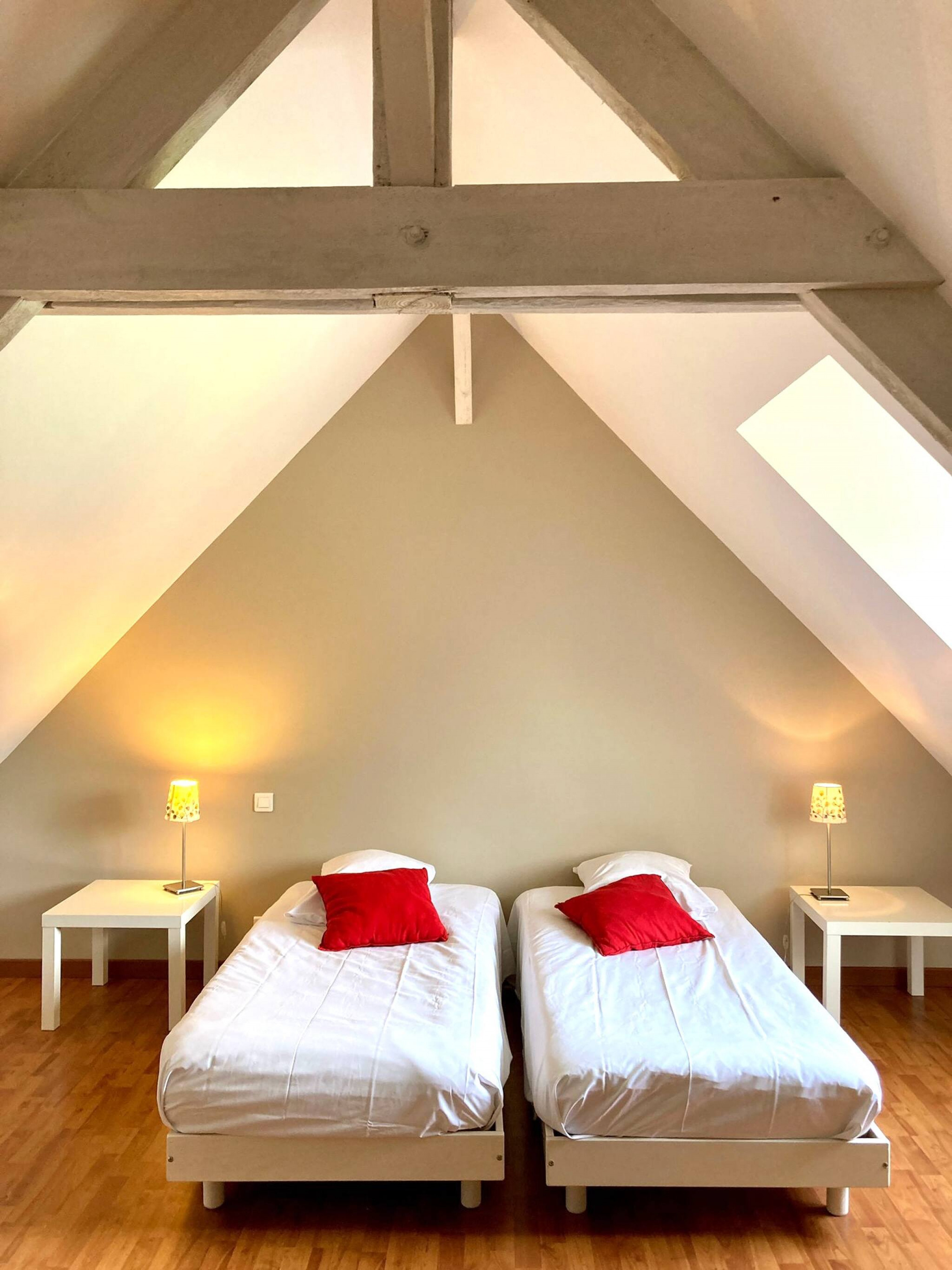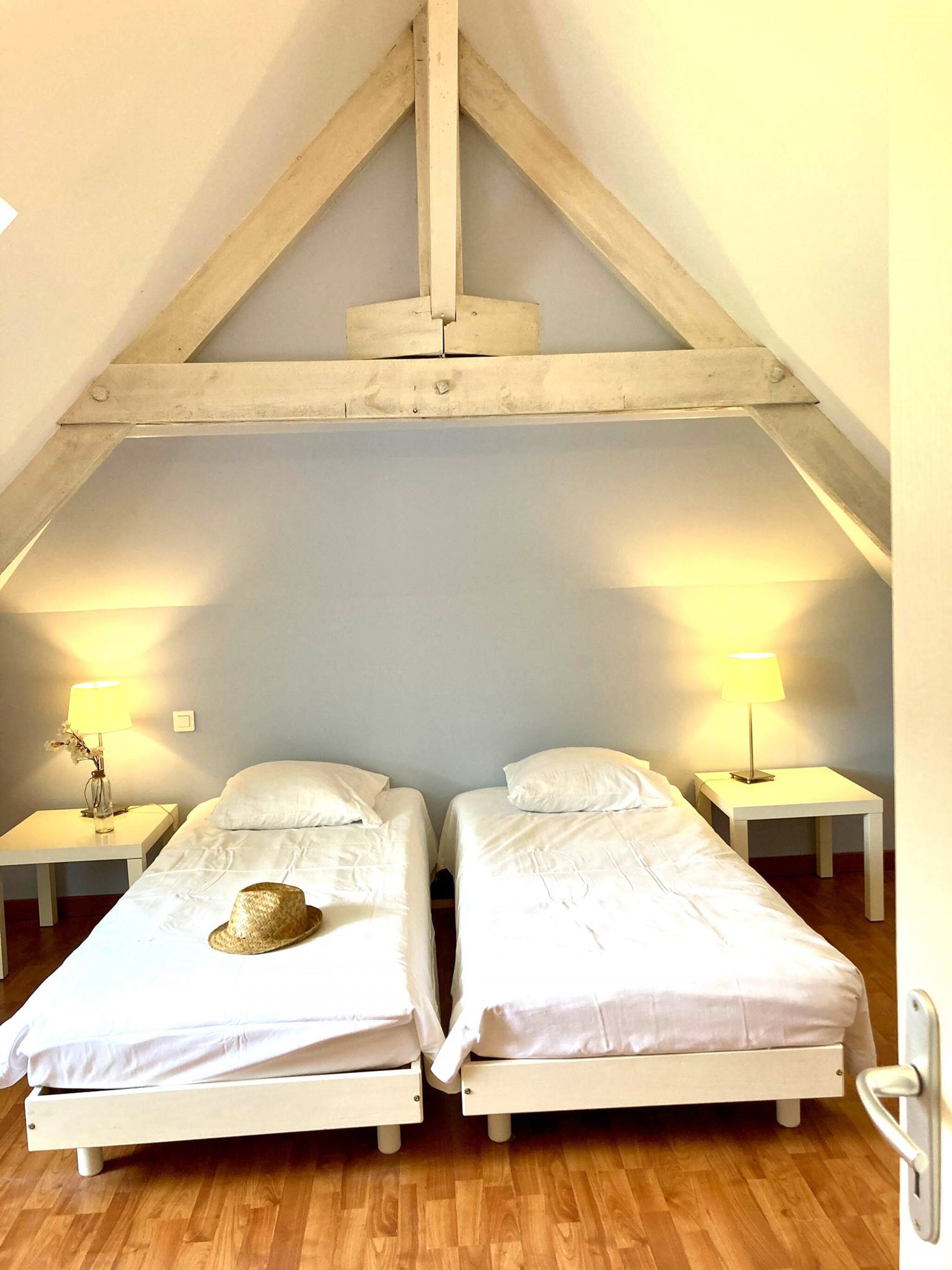 À l'étage : 2 chambres avec 2 lits simples (90x190) avec commode, 1 salle de bains avec toilettes.
