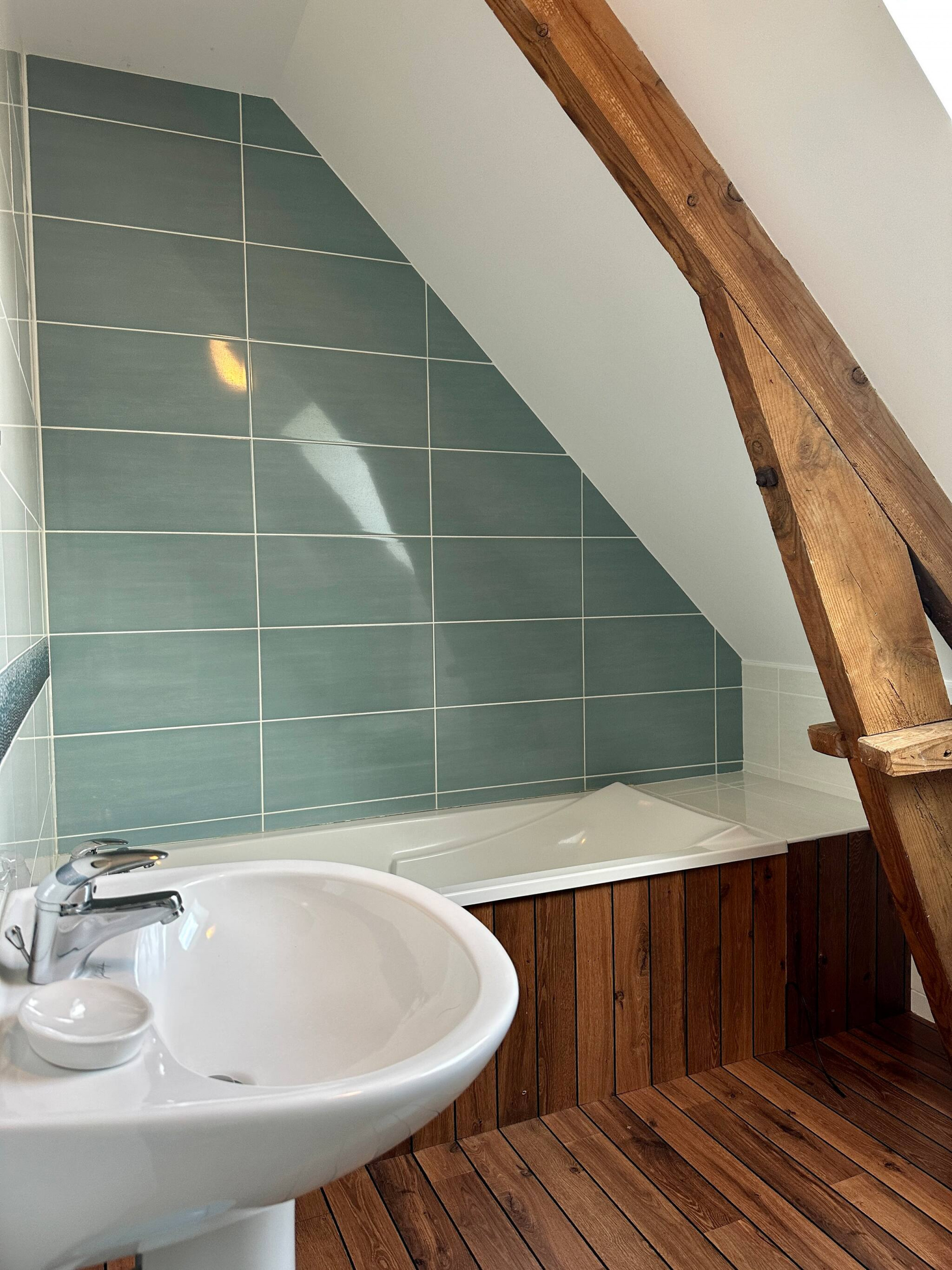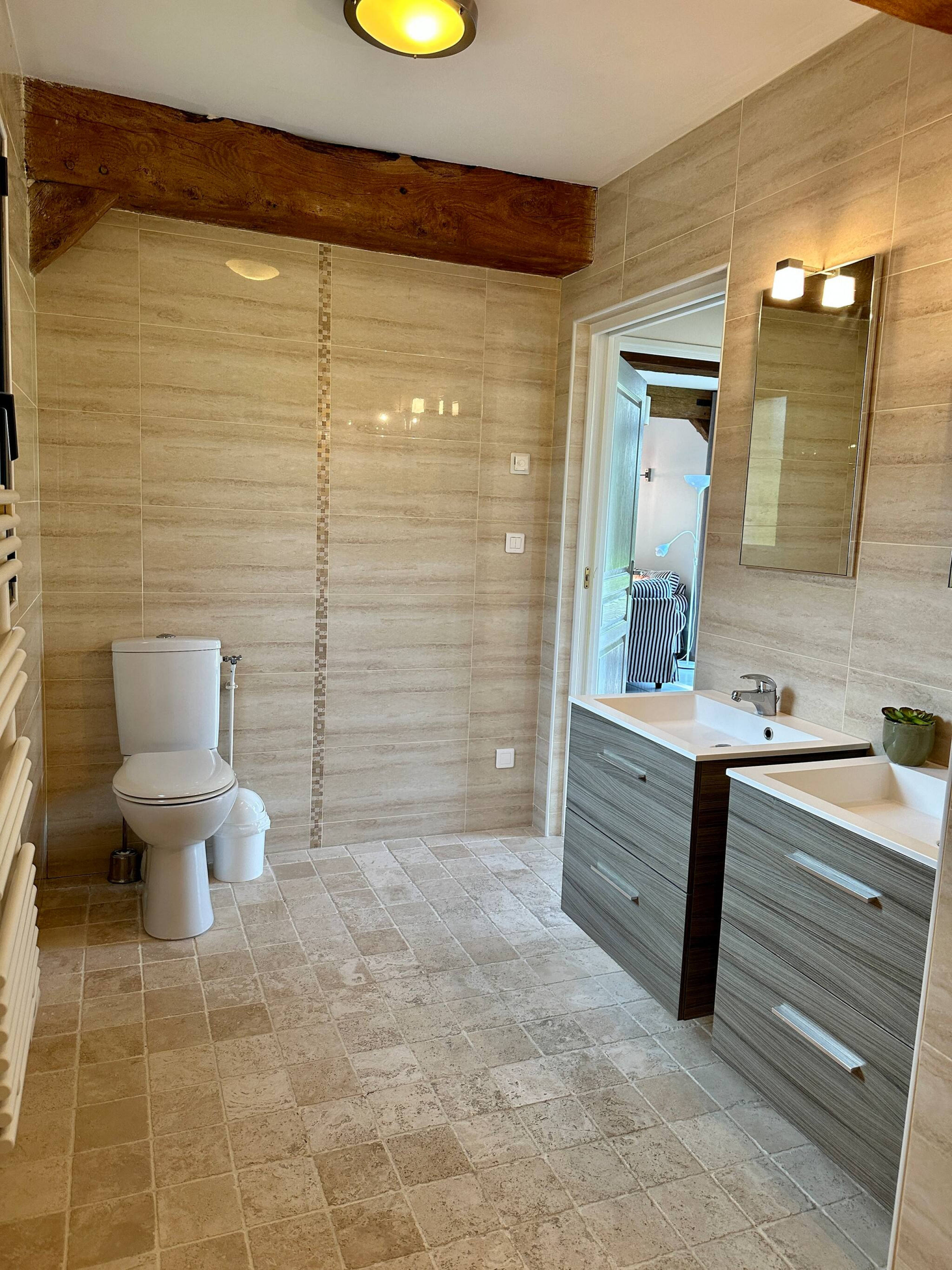 À l'étage : 2 chambres avec 2 lits simples (90x190) avec commode, 1 salle de bain avec toilettes.